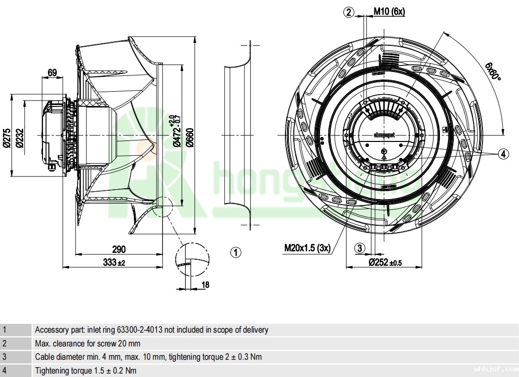 ebmpapst 630mm R3G630-RB32-03 Centrifugal Fan 400V 1400RPM 3600W 5.5A IP55 EC Fan for AHU Retrofit