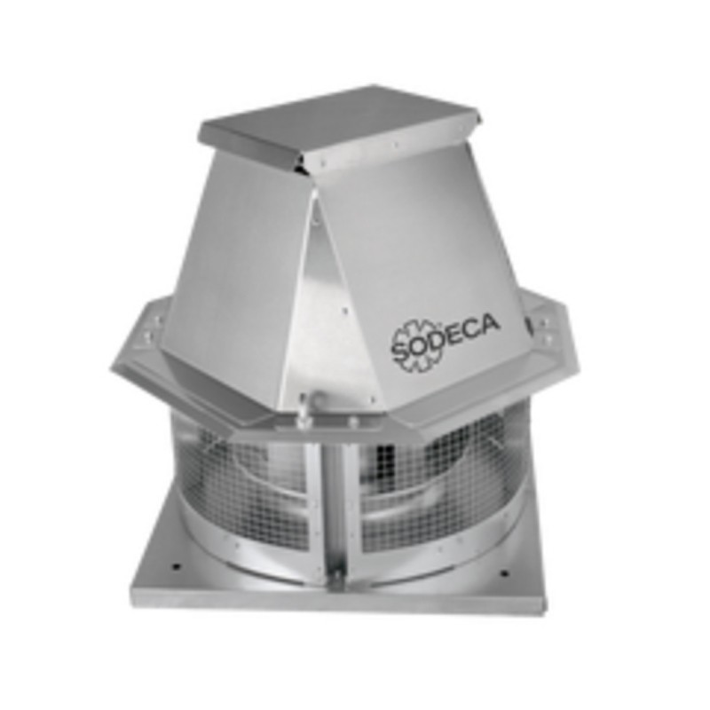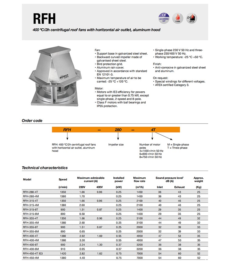400 ºC/2h centrifugal roof fans with horitzontal air outlet, aluminum hood